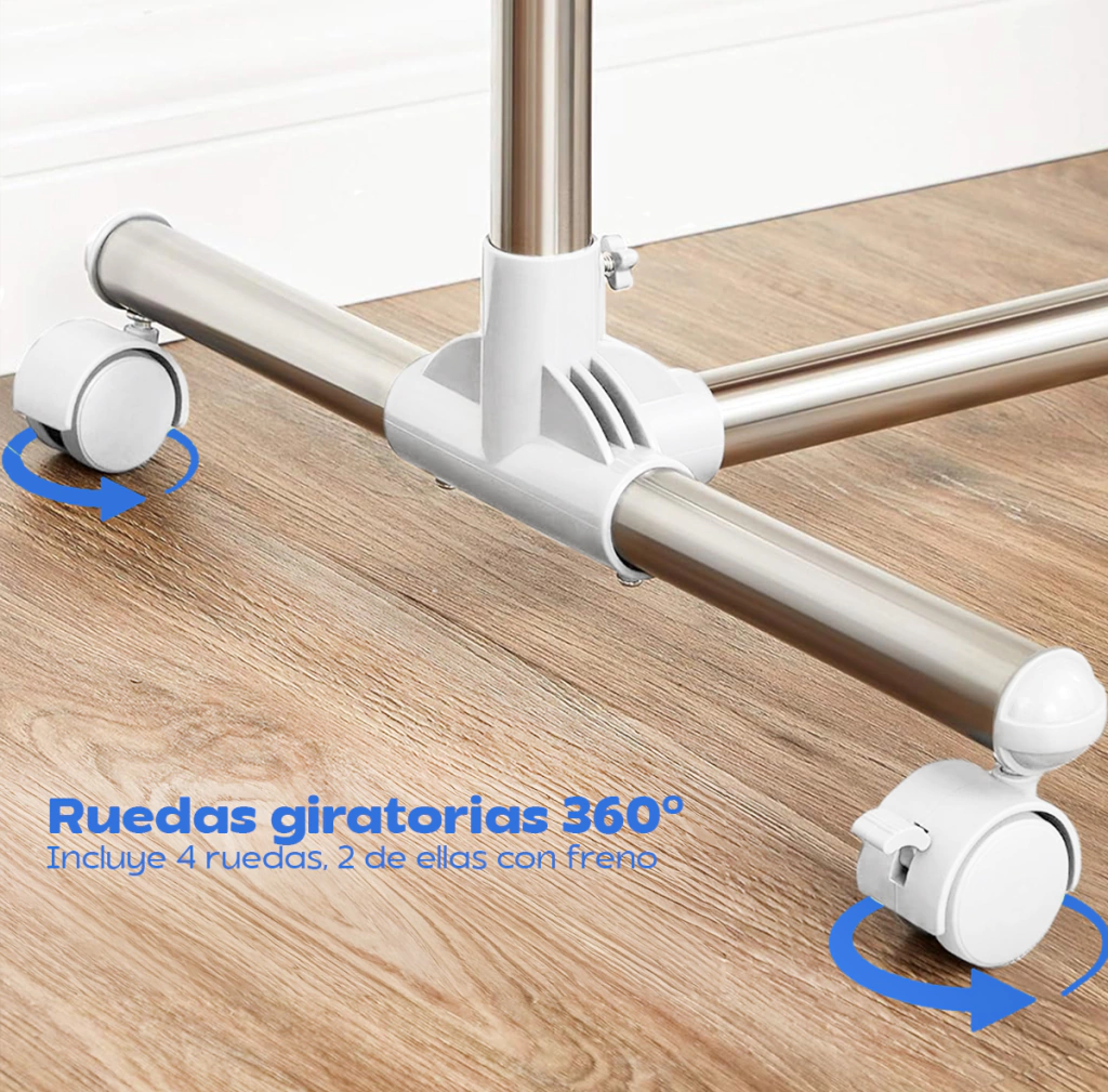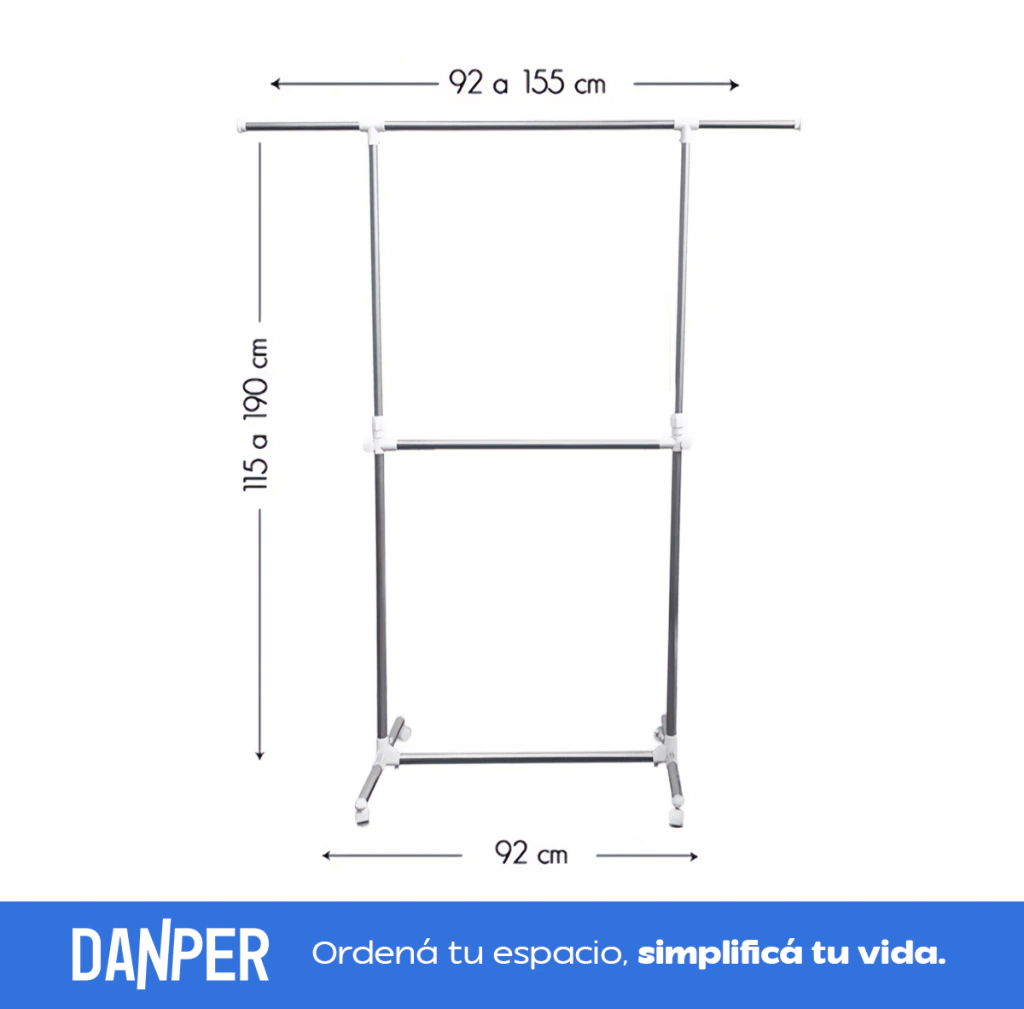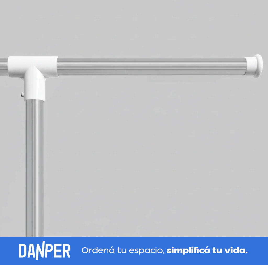 Diseño Regulable: Este perchero cuenta con un caño regulable en altura, permitiendo adaptarlo a distintas necesidades y espacios.